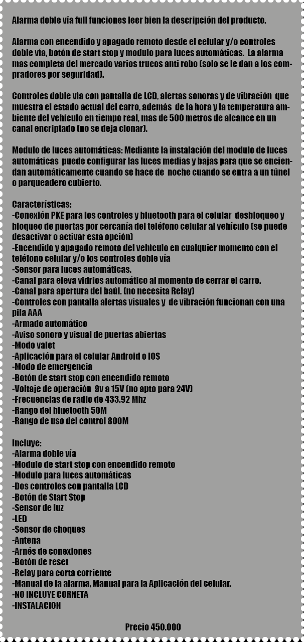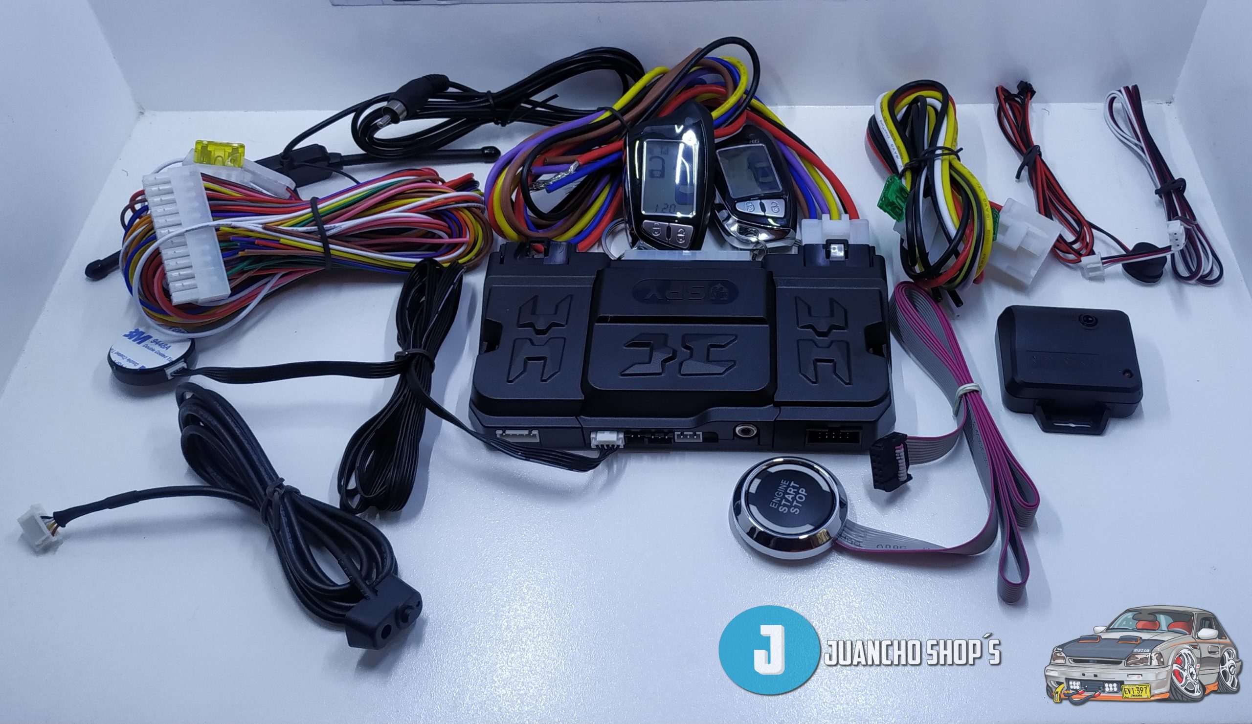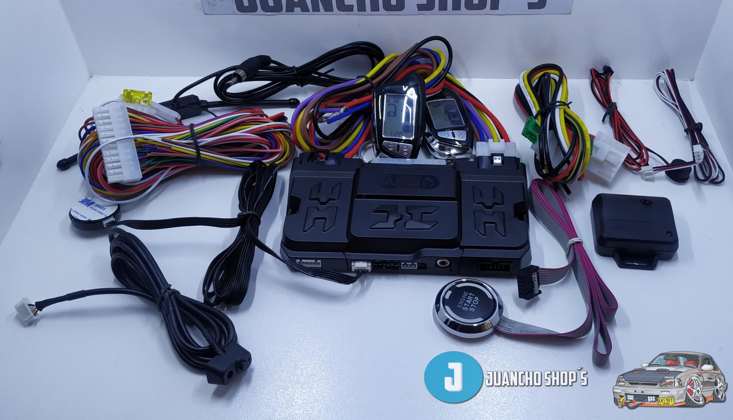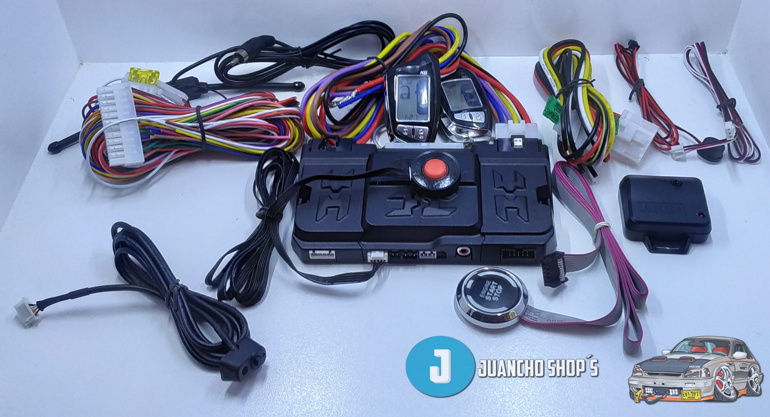 Alarma con encendido y apagado remoto desde el celular y/o controles doble vía, botón de start stop y modulo para luces automáticas. La alarma mas completa del mercado varios trucos anti robo (solo se le dan a los compradores por seguridad).