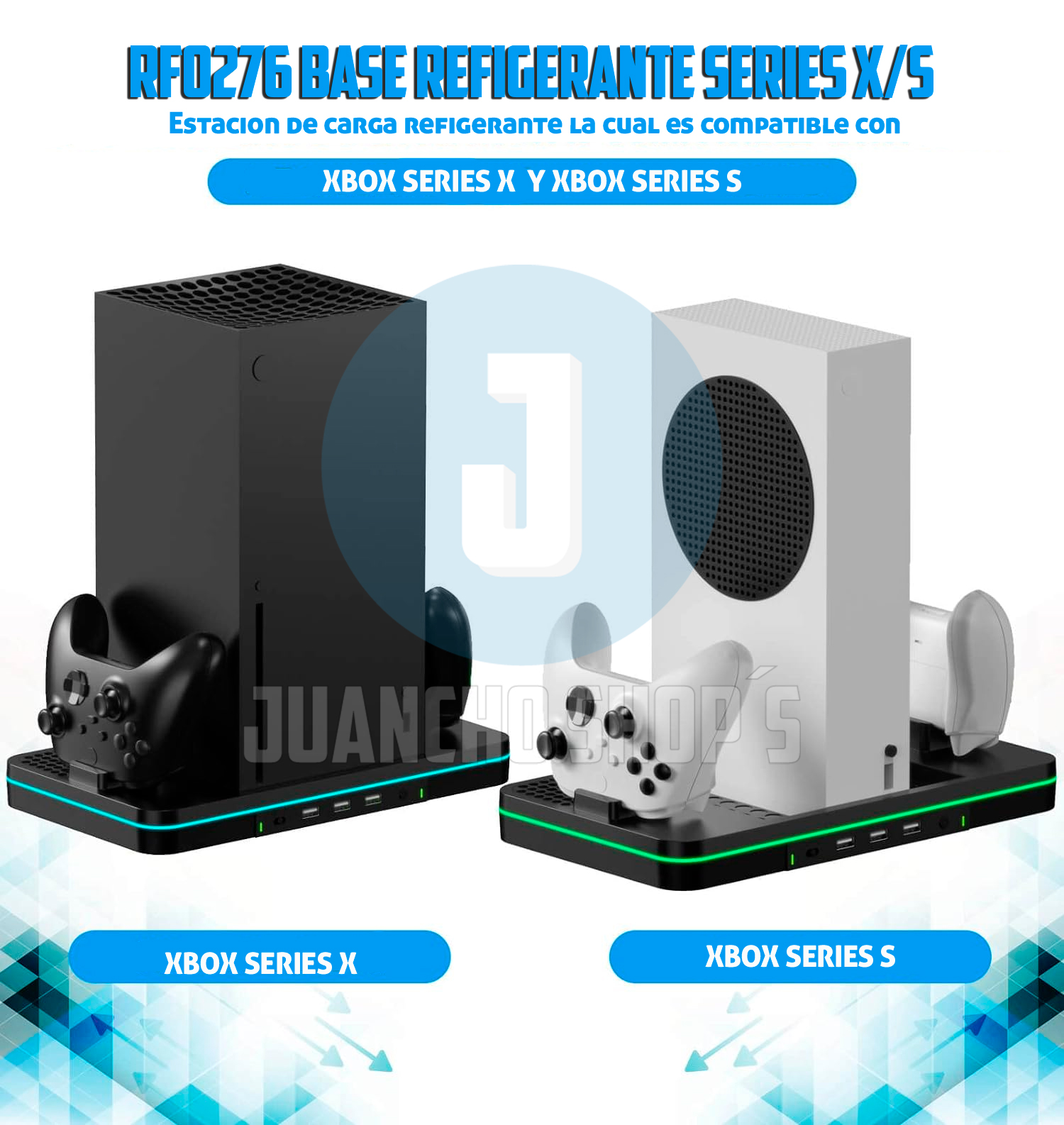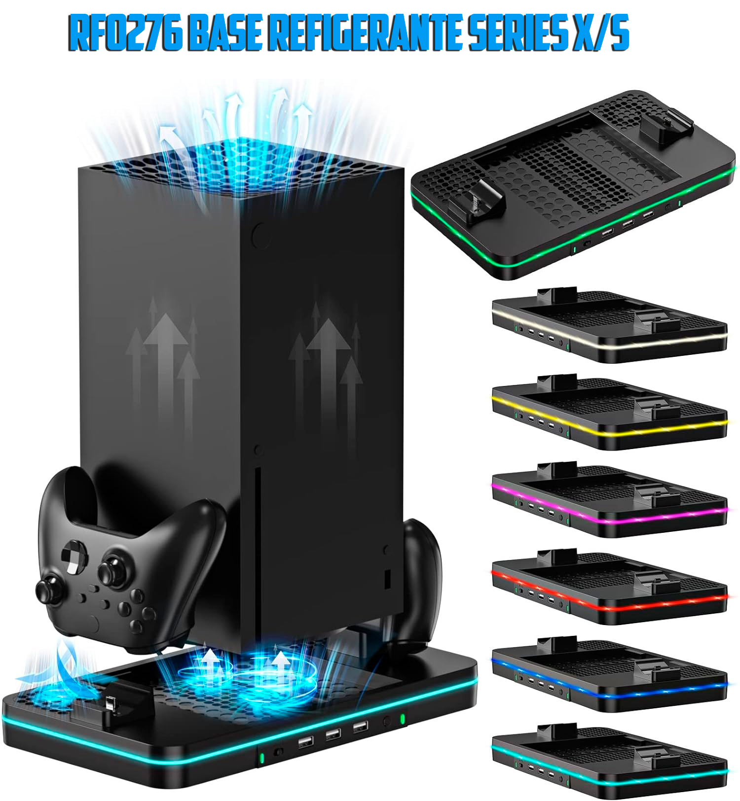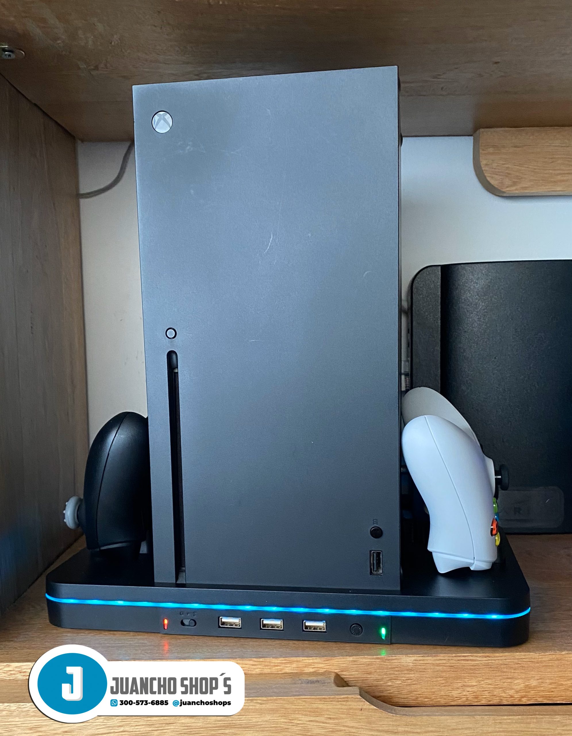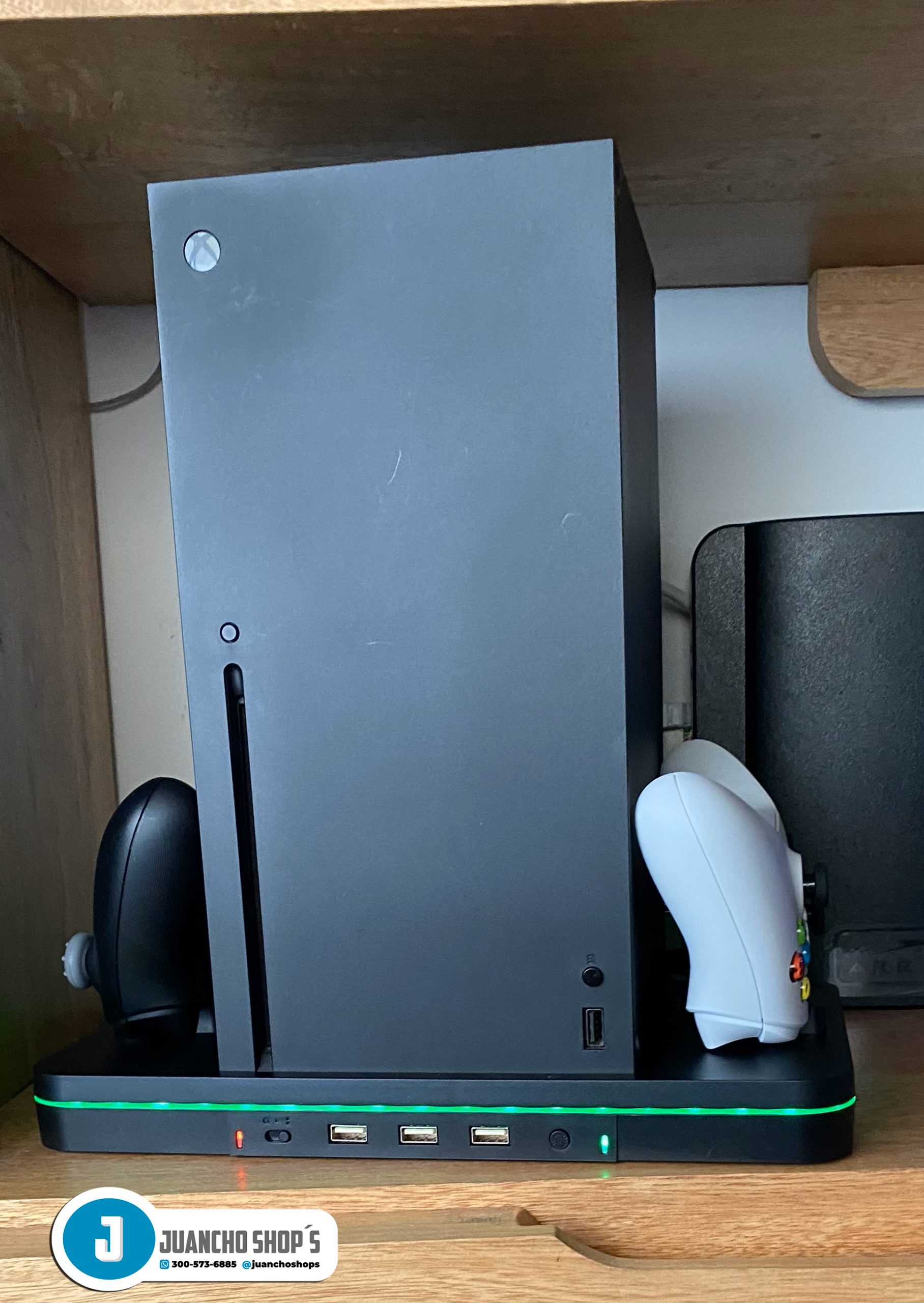 Este soporte de carga con ventilador de refrigeración es compatible con Xbox Series X/S Está integrado en 2 ventiladores de refrigeración mejorados para mantener tu consola fresca, 2 puertos de carga para controles XBOX Series X/S, adema de tres puertos USB.