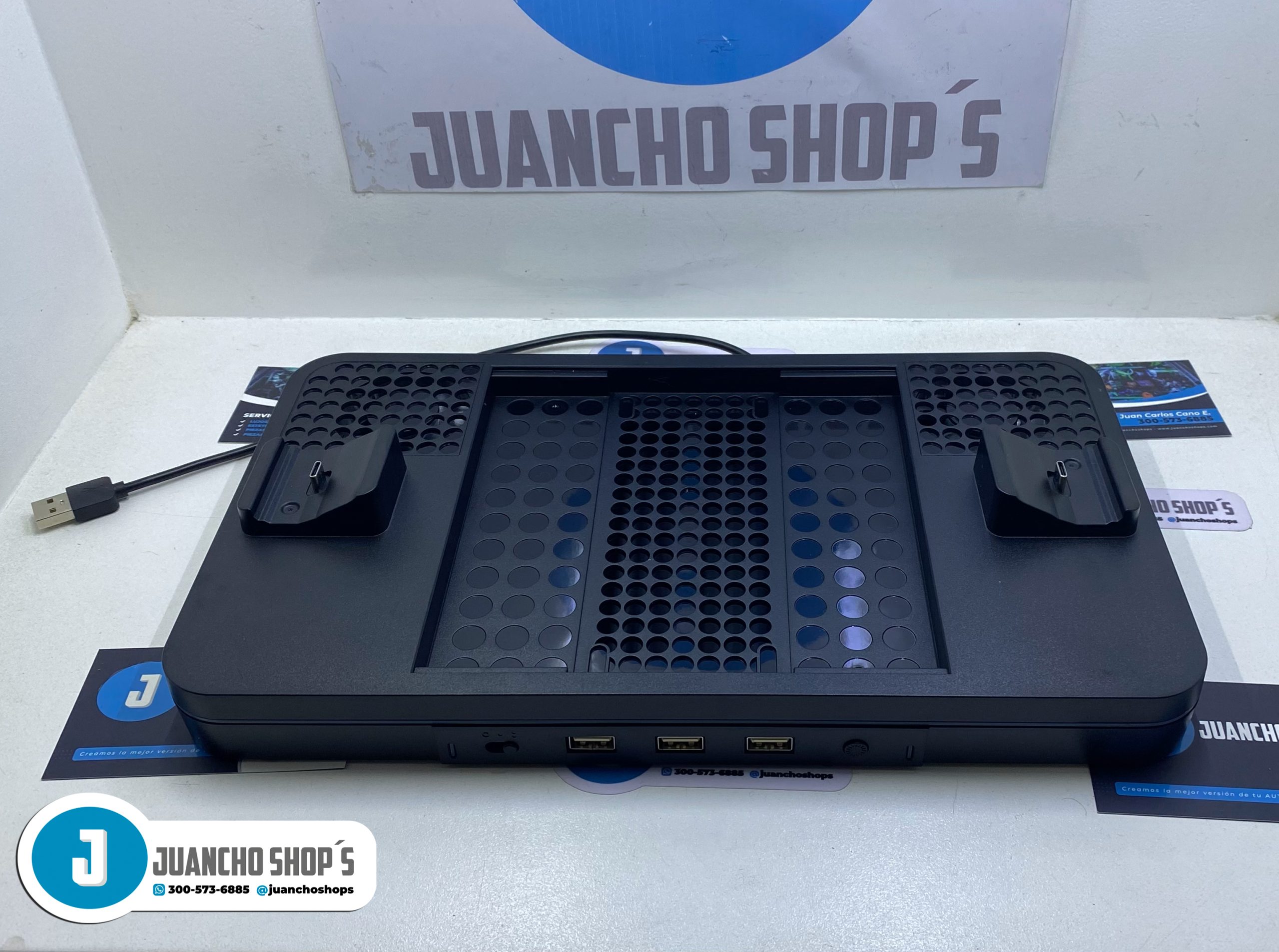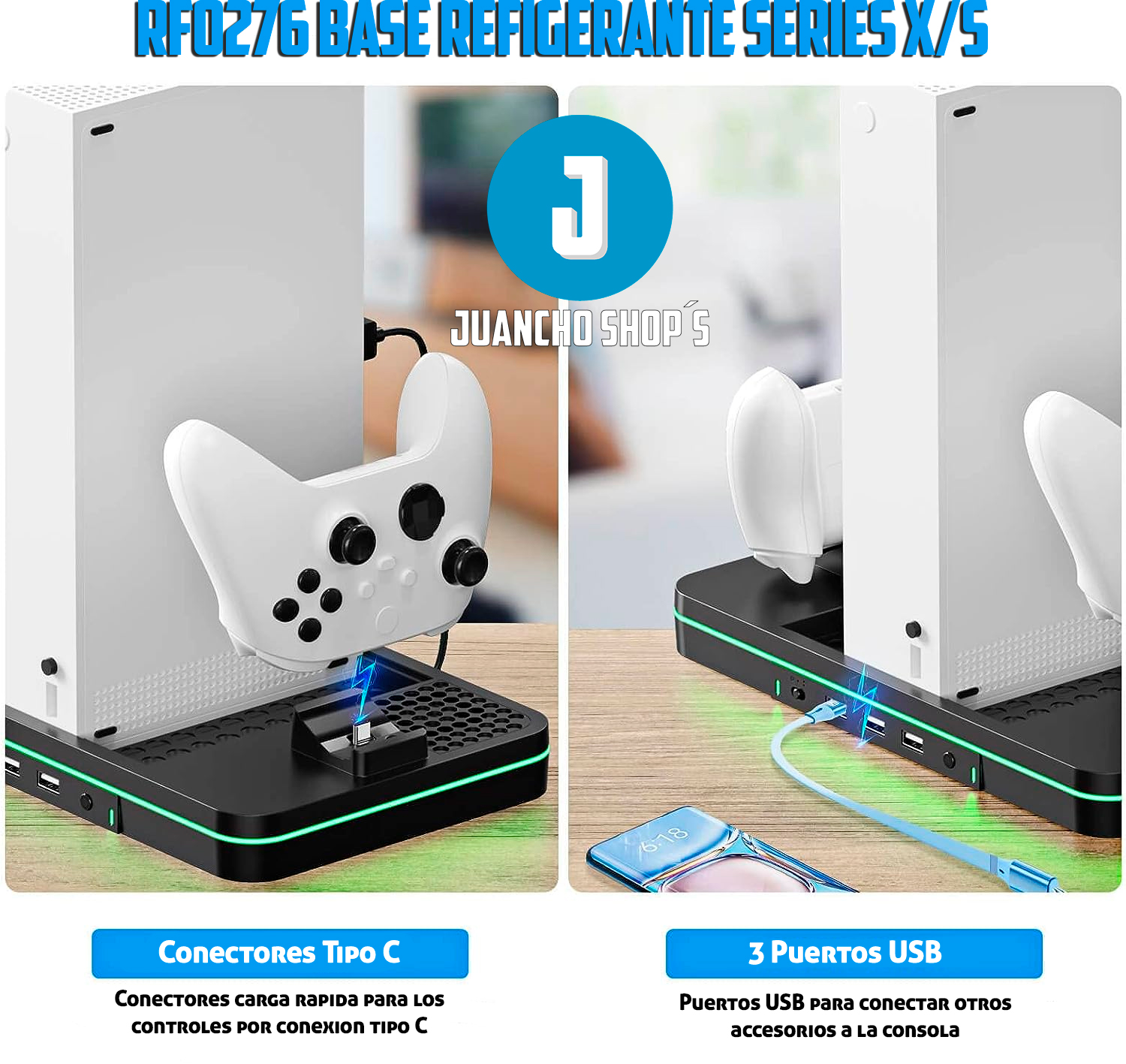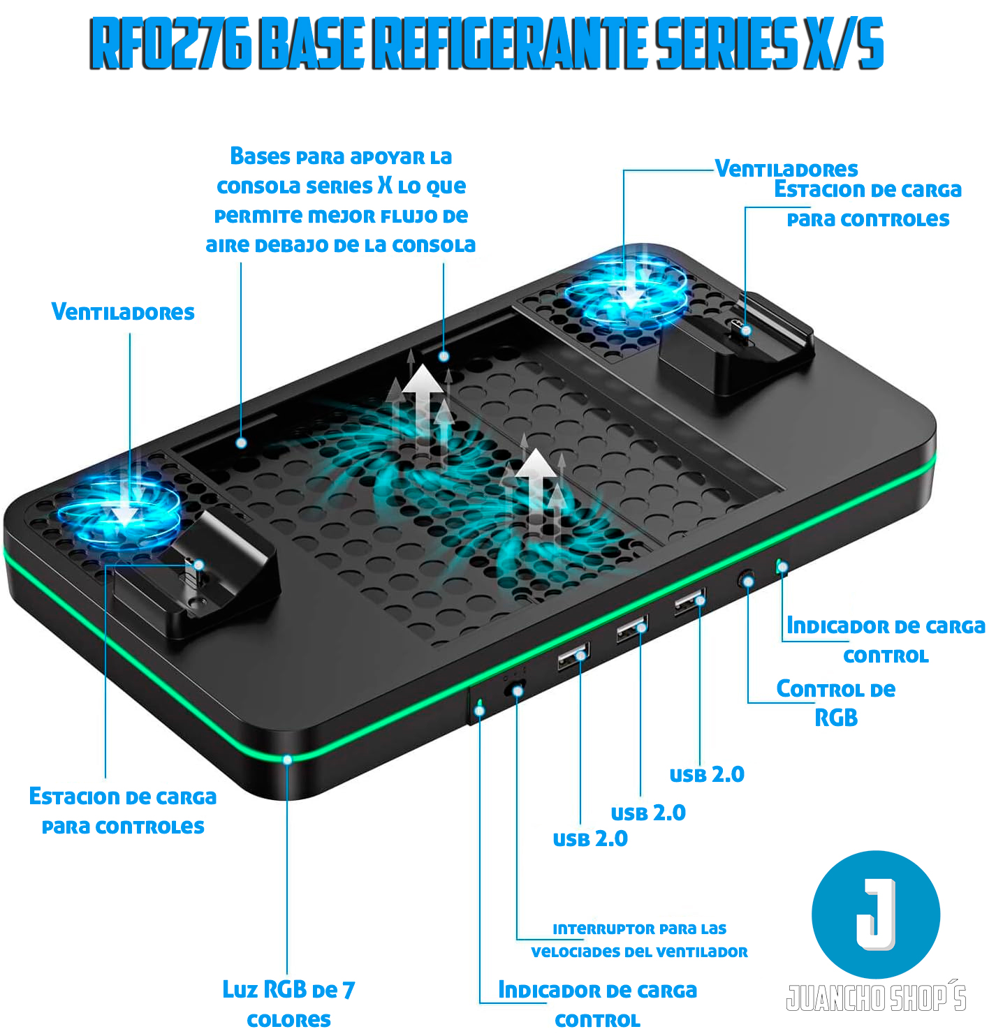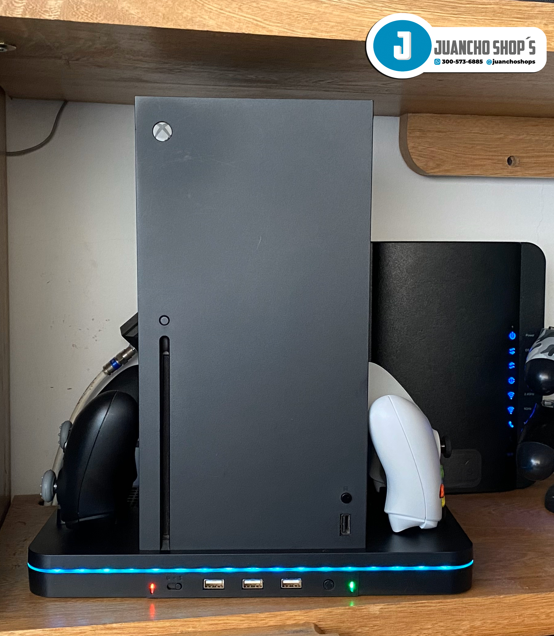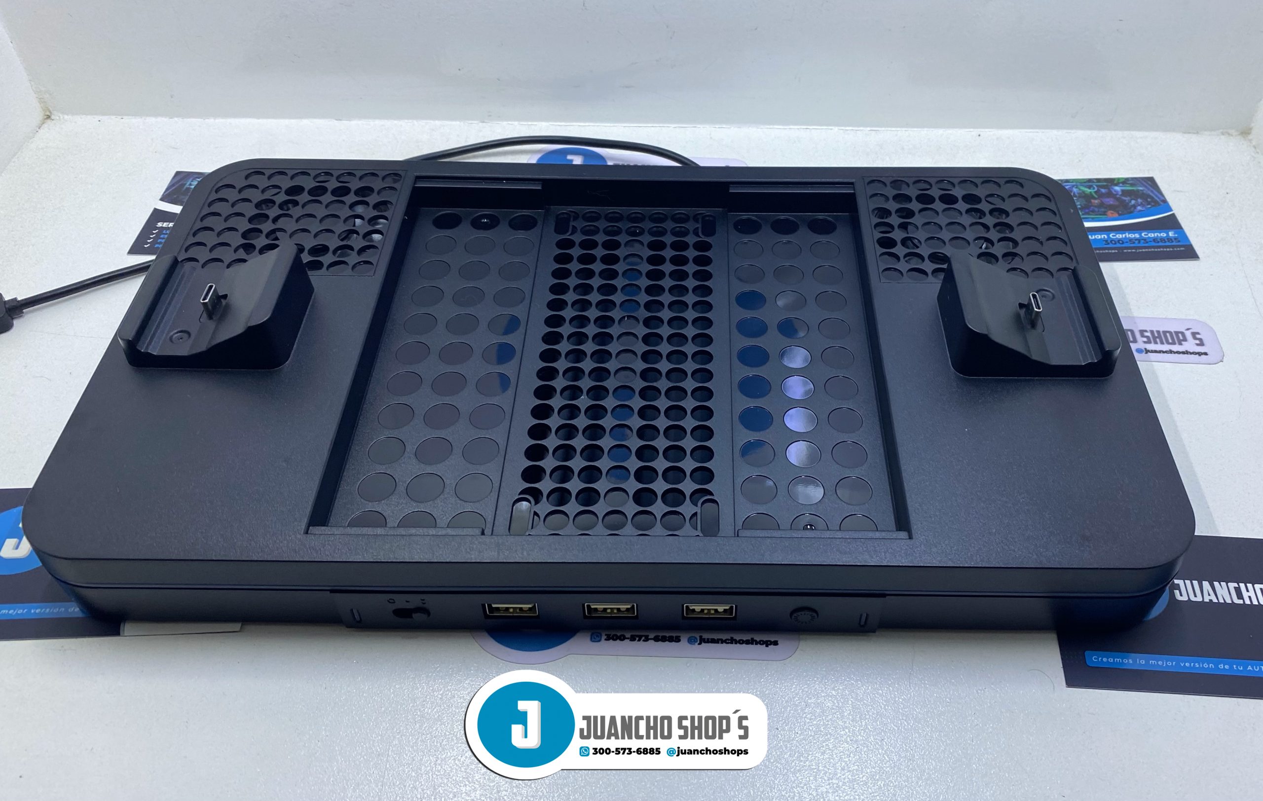 Este soporte de carga con ventilador de refrigeración es compatible con Xbox Series X/S Está integrado en 2 ventiladores de refrigeración mejorados para mantener tu consola fresca, 2 puertos de carga para controles XBOX Series X/S, adema de tres puertos USB.