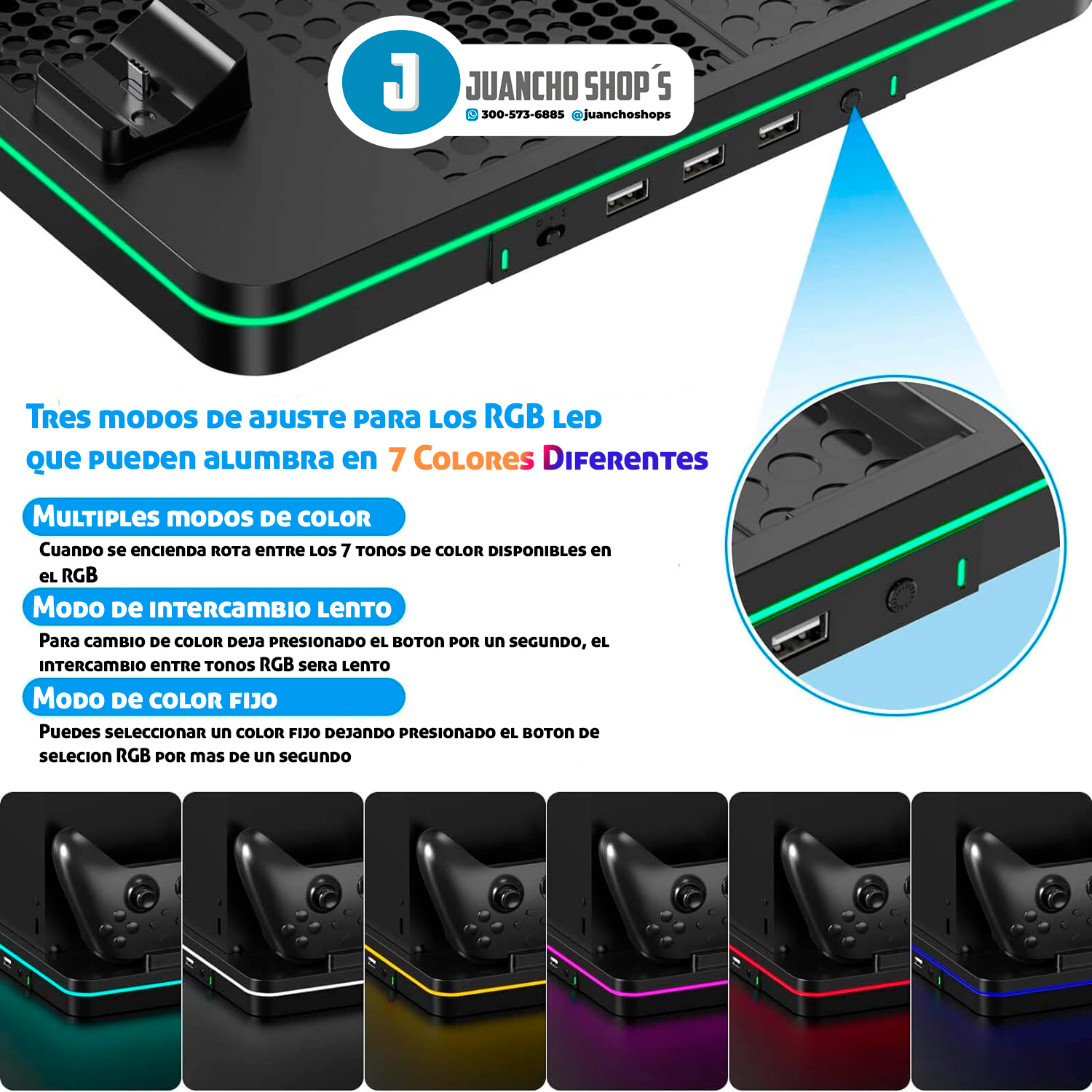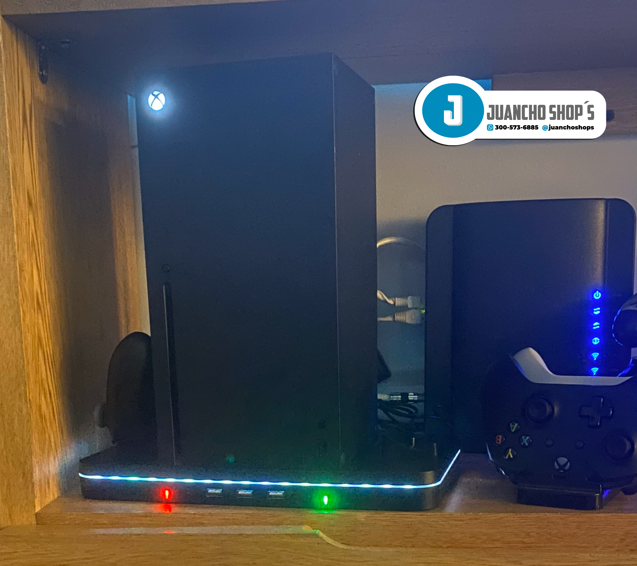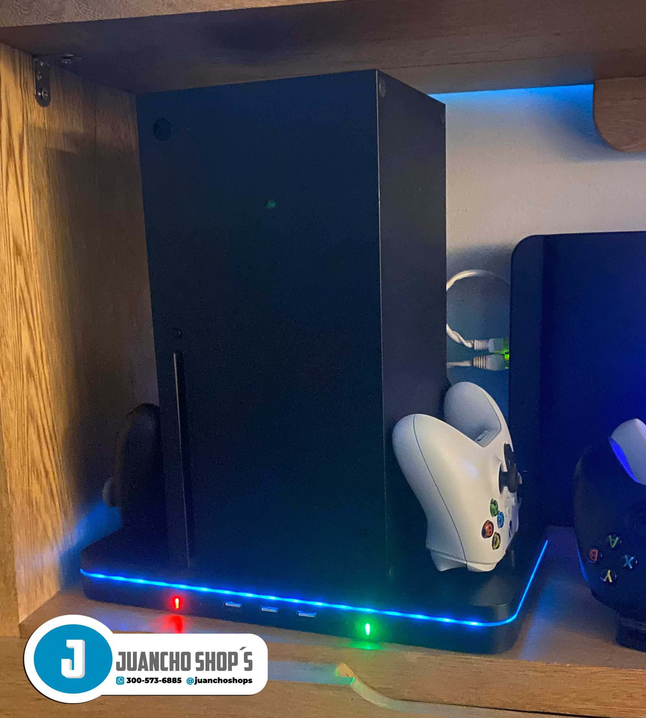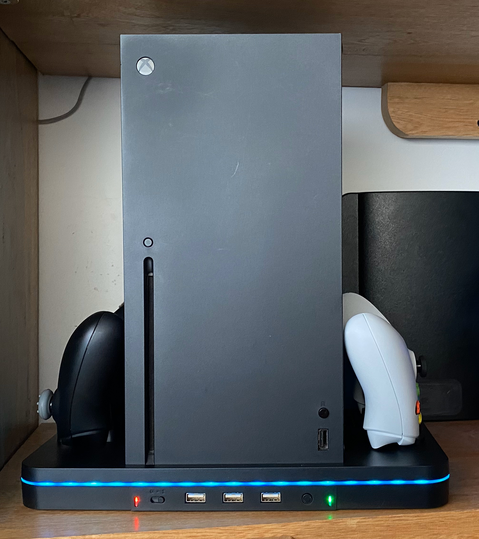 Este soporte de carga con ventilador de refrigeración es compatible con Xbox Series X/S Está integrado en 2 ventiladores de refrigeración mejorados para mantener tu consola fresca, 2 puertos de carga para controles XBOX Series X/S, adema de tres puertos USB.