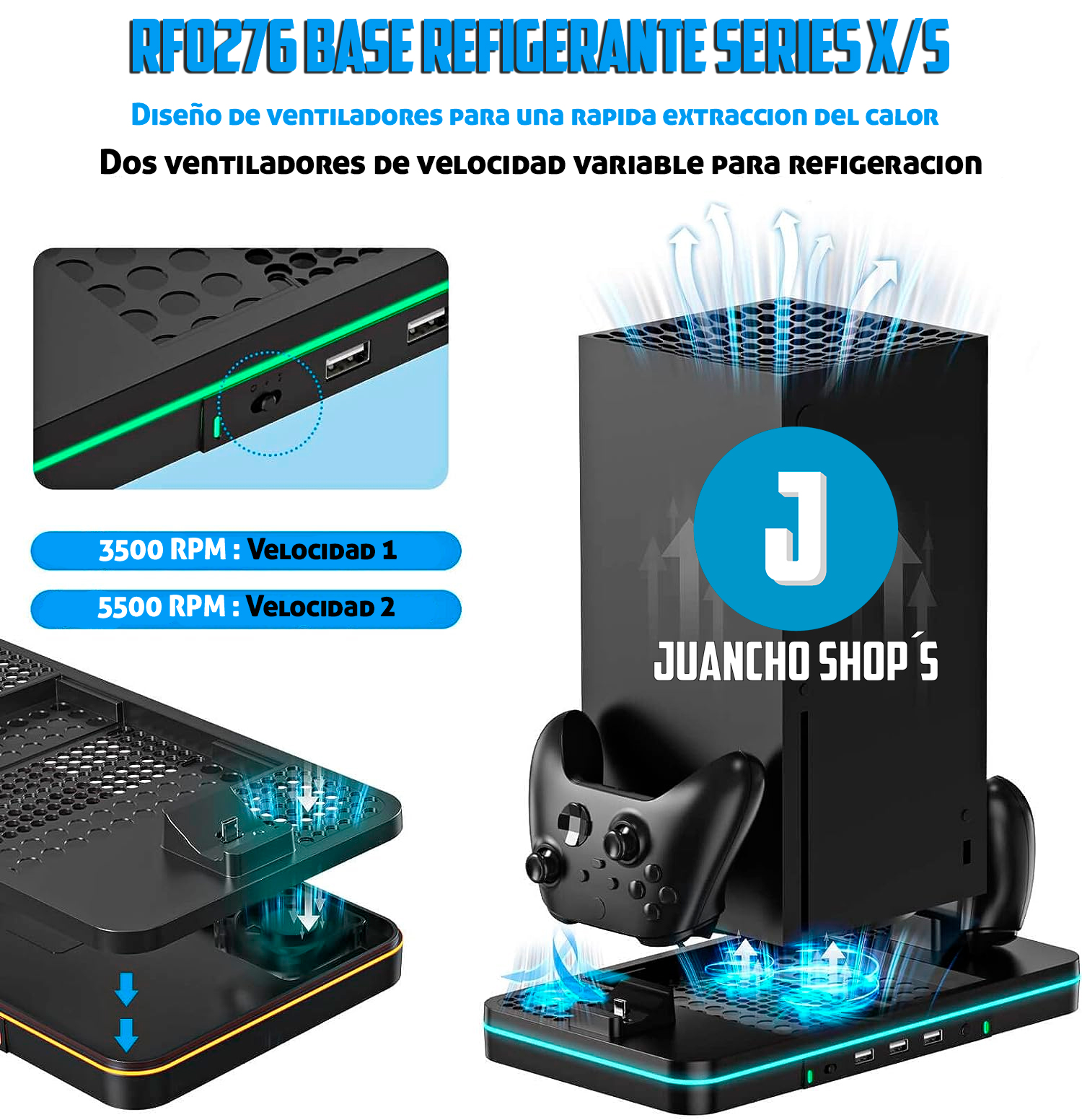 Dos ventiladores de alta eficiencia con 2 velocidades de : 3500/5000 RPM. El ventilador está ubicado junto a la consola, proporcionando una distribución más eficaz del flujo de aire al permitir que el viento sopla desde el centro hasta los agujeros de refrigeración en las 4 esquinas de la consola Xbox Series X.