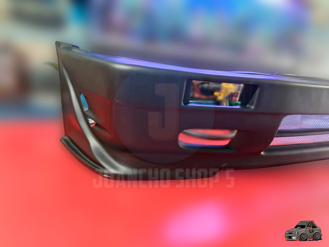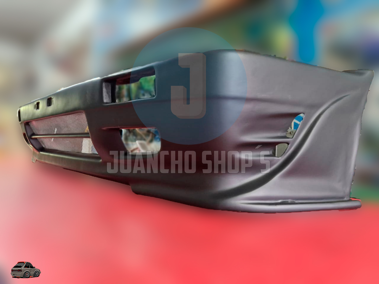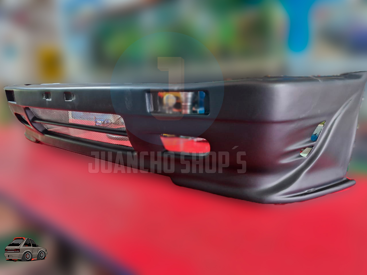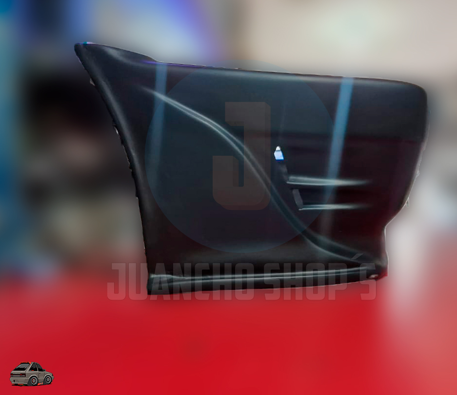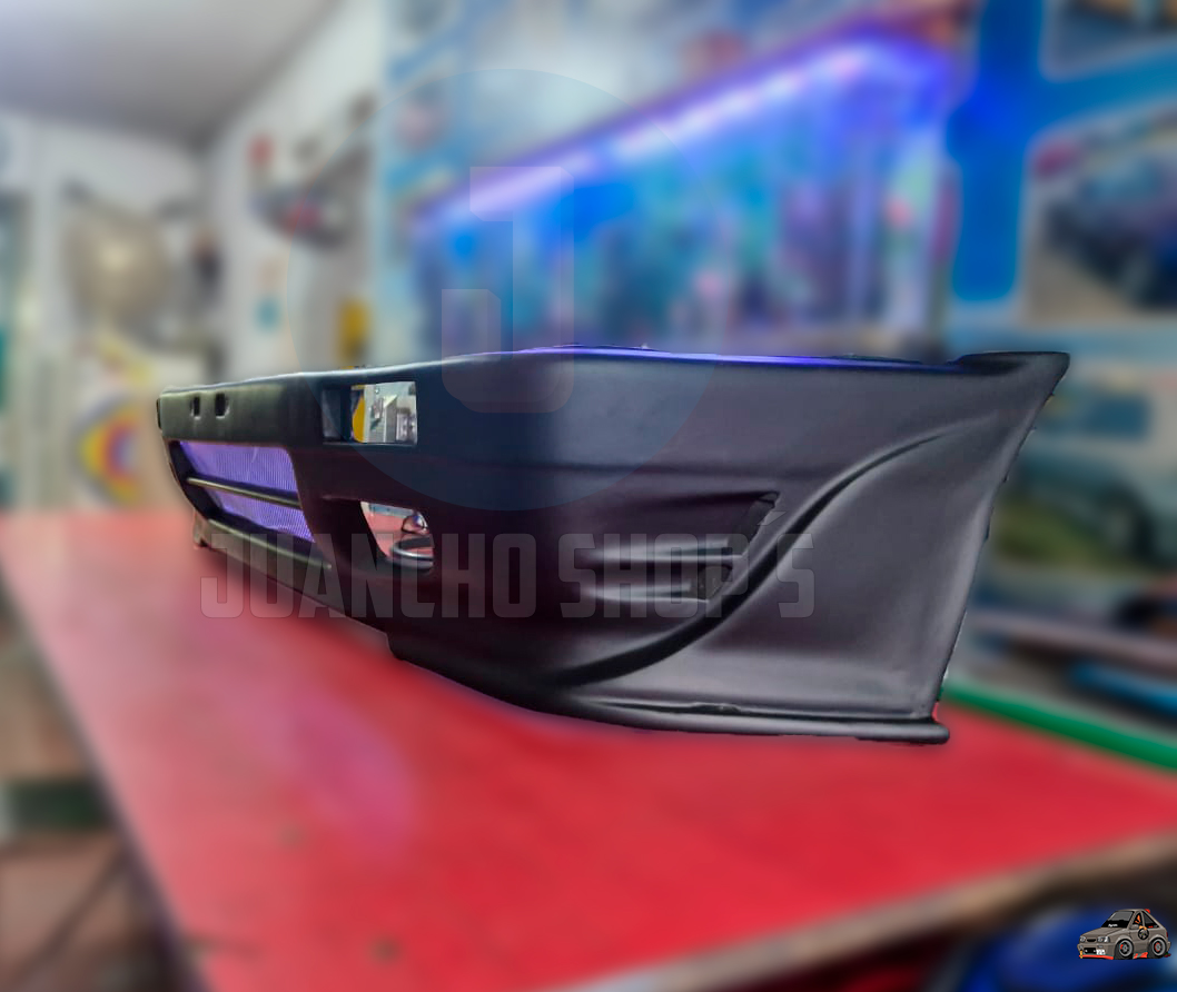 Defensa personalizada para Mazda 323 con entradas de aire a los laterales, y malla en el centro, difusores laterales y entrada de aire central inferior. fabricada en fibra de vidrio!