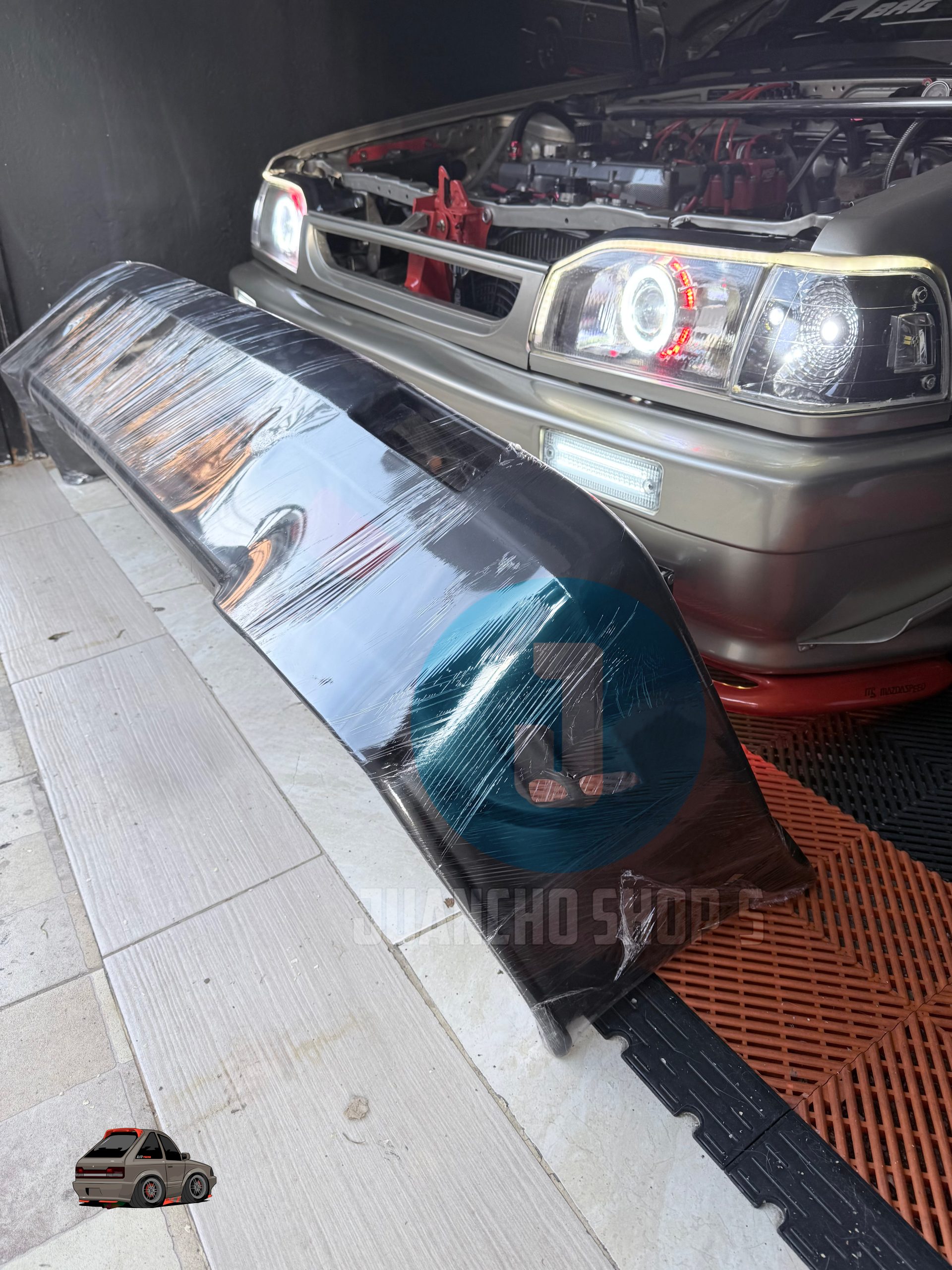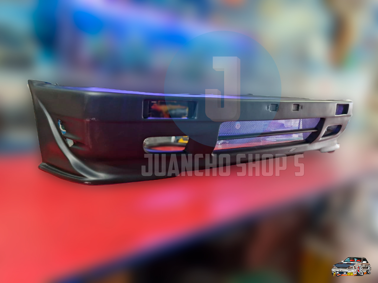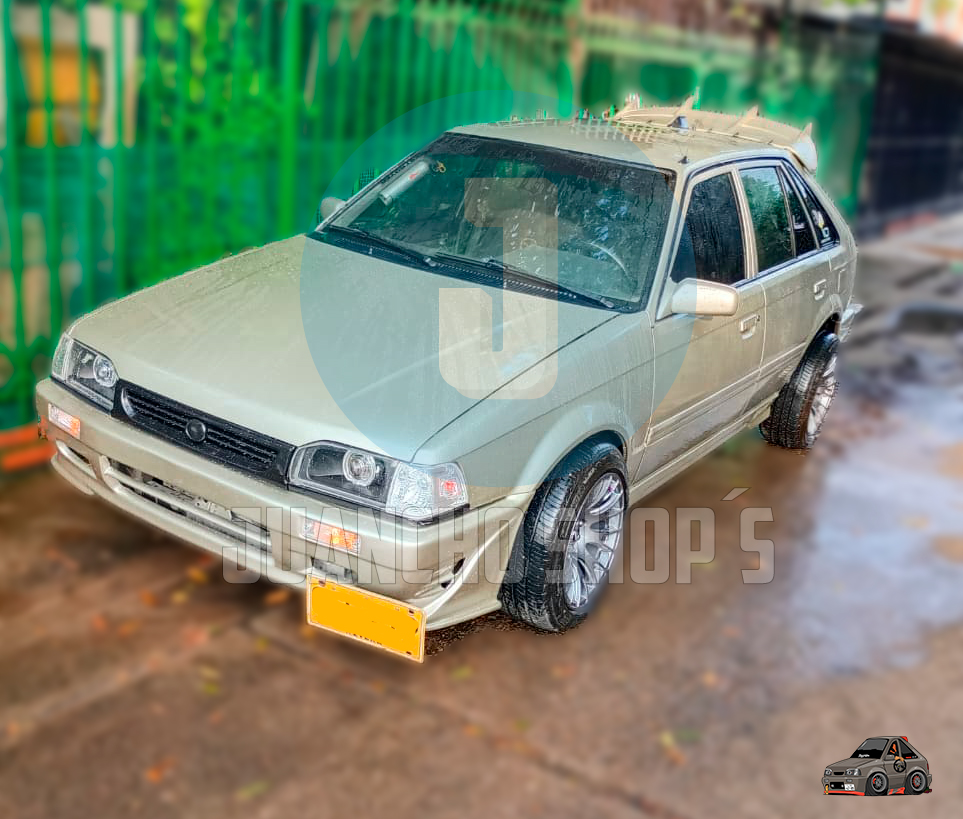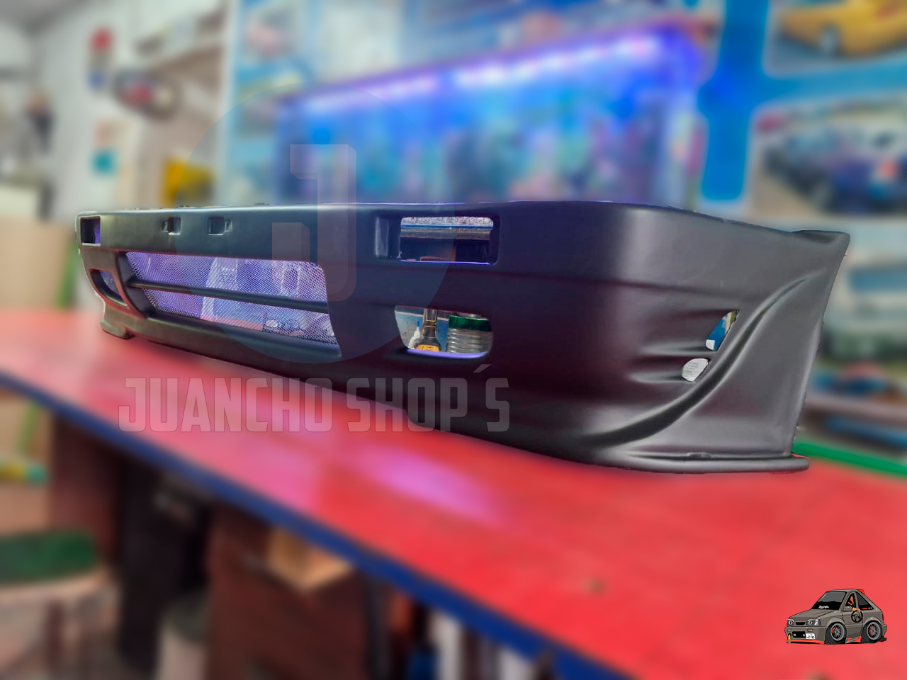 Defensa personalizada para Mazda 323 con entradas de aire a los laterales, y malla en el centro, difusores laterales y entrada de aire central inferior. fabricada en fibra de vidrio!