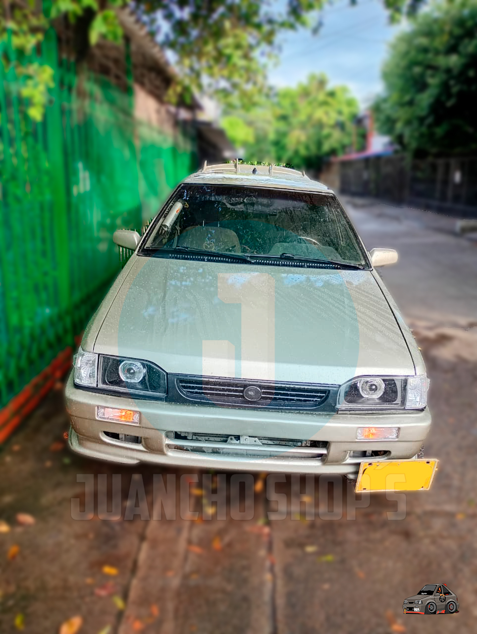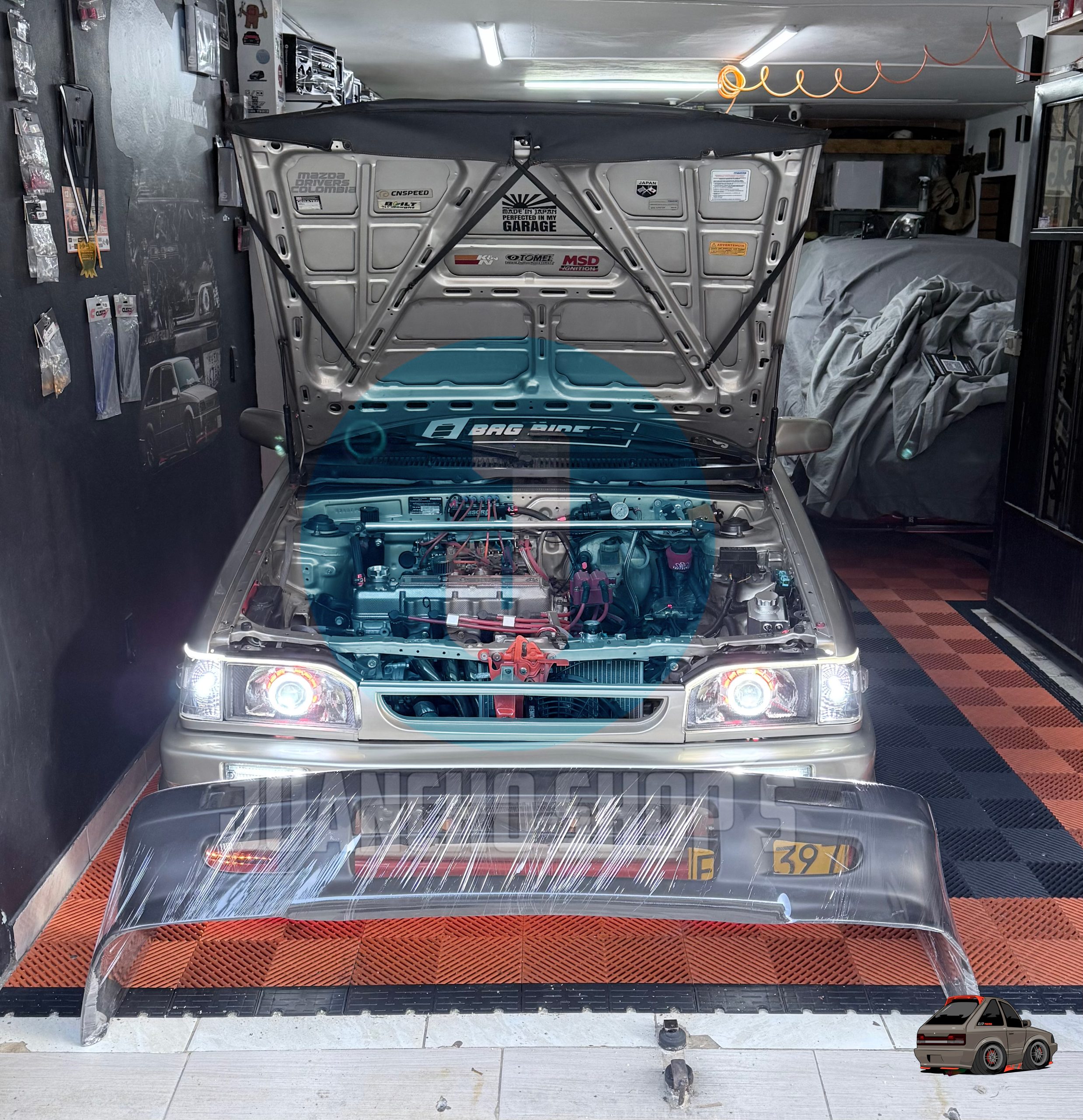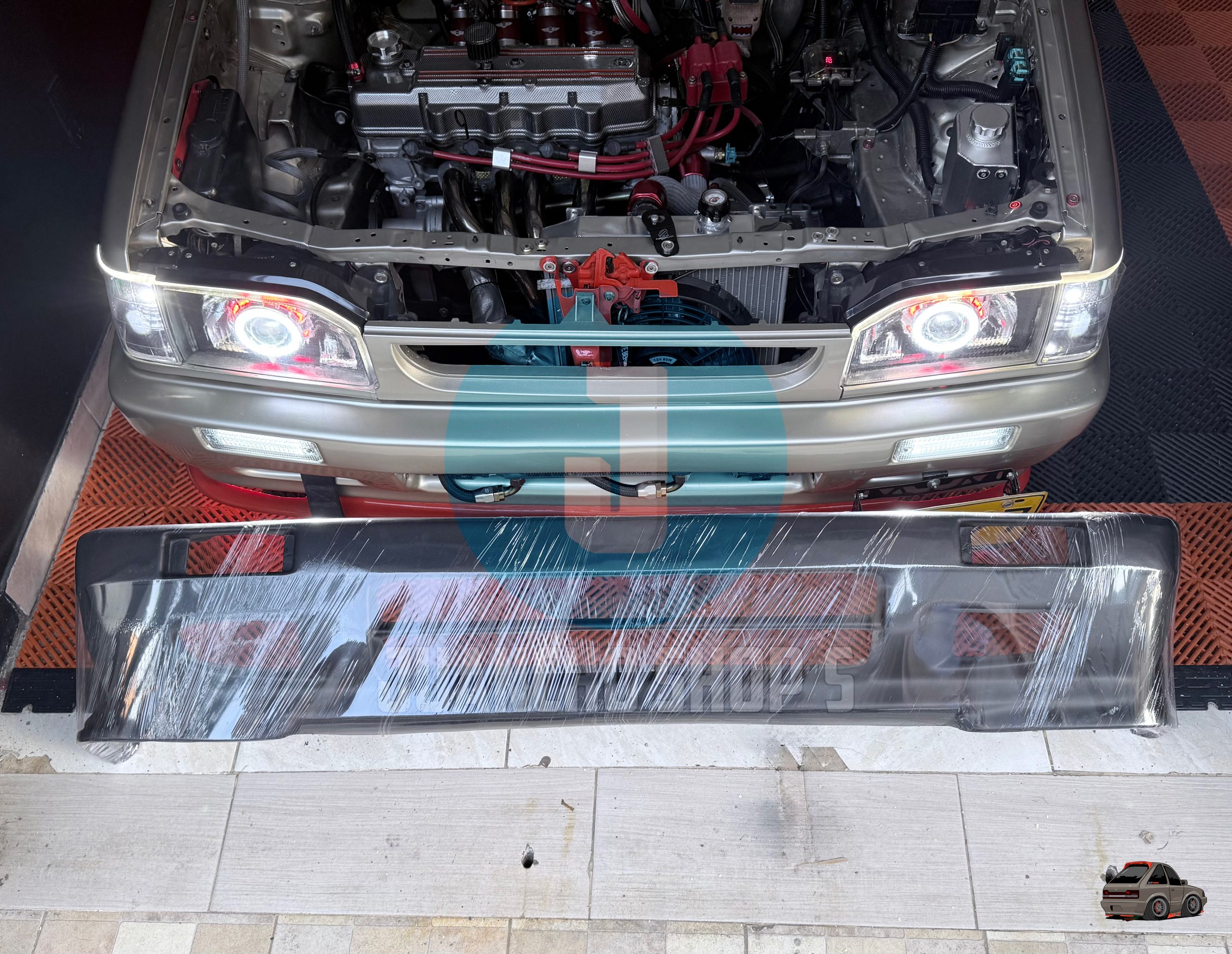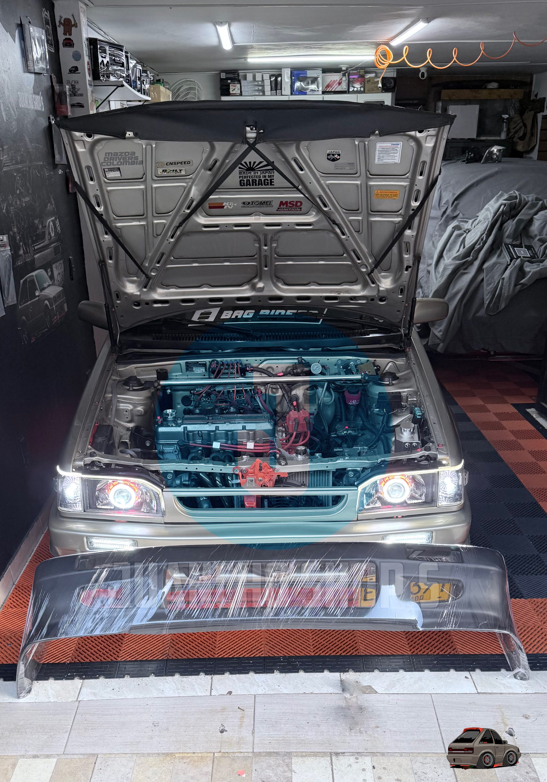 Defensa personalizada para Mazda 323 con entradas de aire a los laterales, y malla en el centro, difusores laterales y entrada de aire central inferior. fabricada en fibra de vidrio!